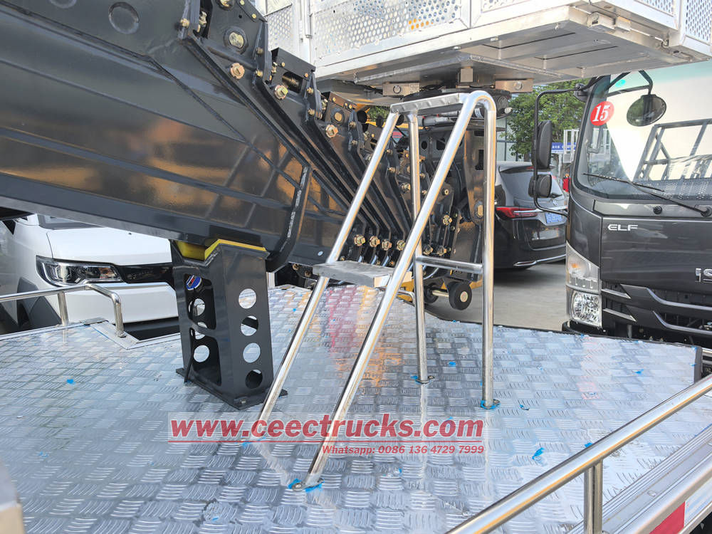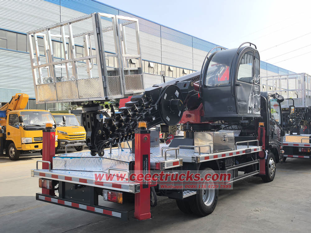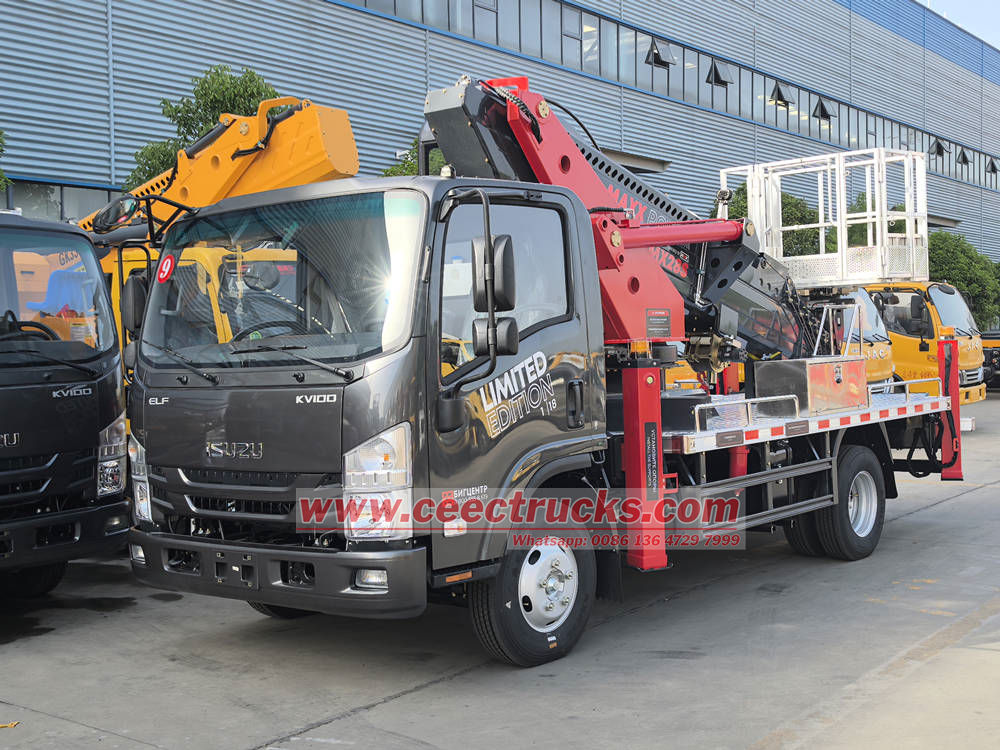 A estrutura central de Caminhão plataforma de trabalho aéreo Isuzu KV100 adota braço reto telescópico feito de aço de alta resistência, que pode atingir elevação suave por meio de acionamento hidráulico e pode facilmente lidar com as necessidades de trabalho aéreo, como construção de paredes externas de edifícios altos, manutenção de pontes, instalação de postes de luz, etc.