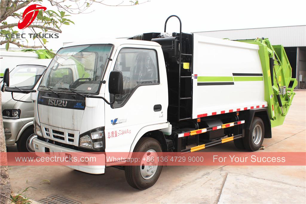 Caminhão compactador de lixo filipino 5cbm à venda com melhor preço, Chassis ISUZU 4x2, equipado com motor diesel de 120 CV, manual MSB de 5 mudanças caixa de engrenagens, caixa de controle PLC, pintura e registros dependem da necessidade.