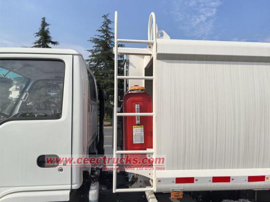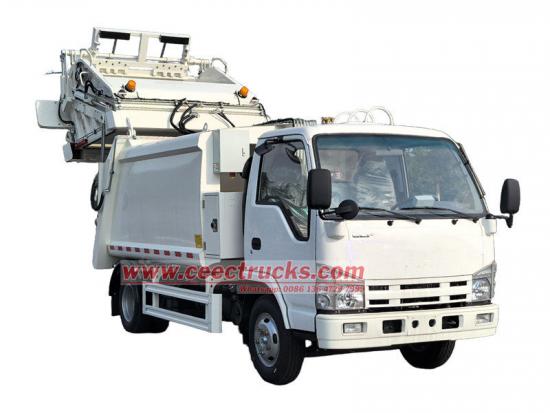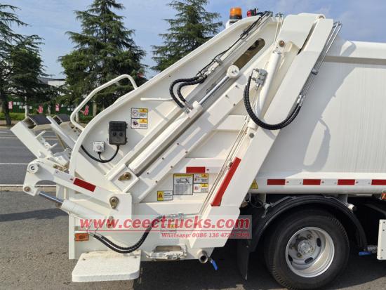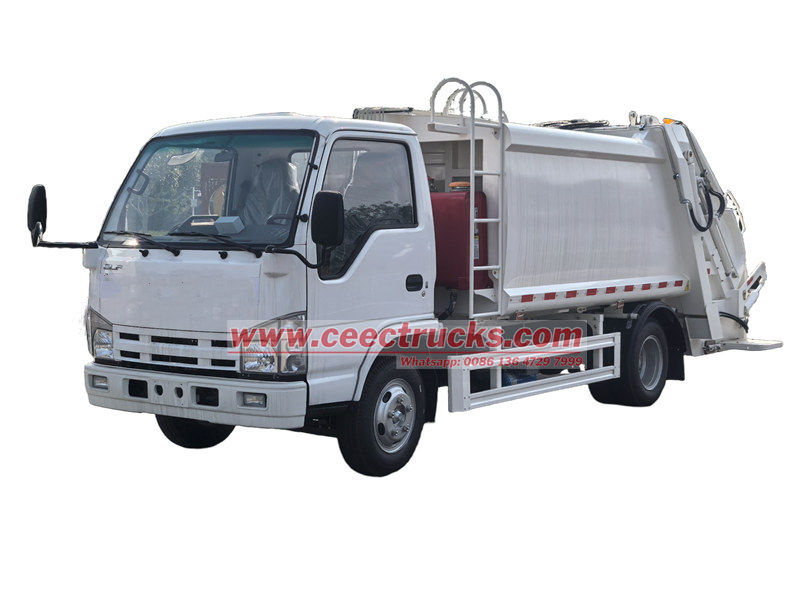 O caminhão compactador hidráulico Isuzu tem uma poderosa função de compressão que pode compactar lixo solto de forma eficiente, aumentar a capacidade de carga e reduzir a frequência de transporte. Com distância entre eixos de 3360 mm com motor 4JB1CN de 98 hp, emissão Euro 4 diesel de 2.771 L, caixa de câmbio Isuzu MSB de 5 marchas, pneus 700R16 com um total de 7 peças, com A/C, USB, assistência de direção, 3 assentos. A parte superior do corpo é uma lixeira de 6 cbm, a traseira é um mecanismo de giro da caçamba, há 3 métodos para operar o caminhão carregando e descarregando.