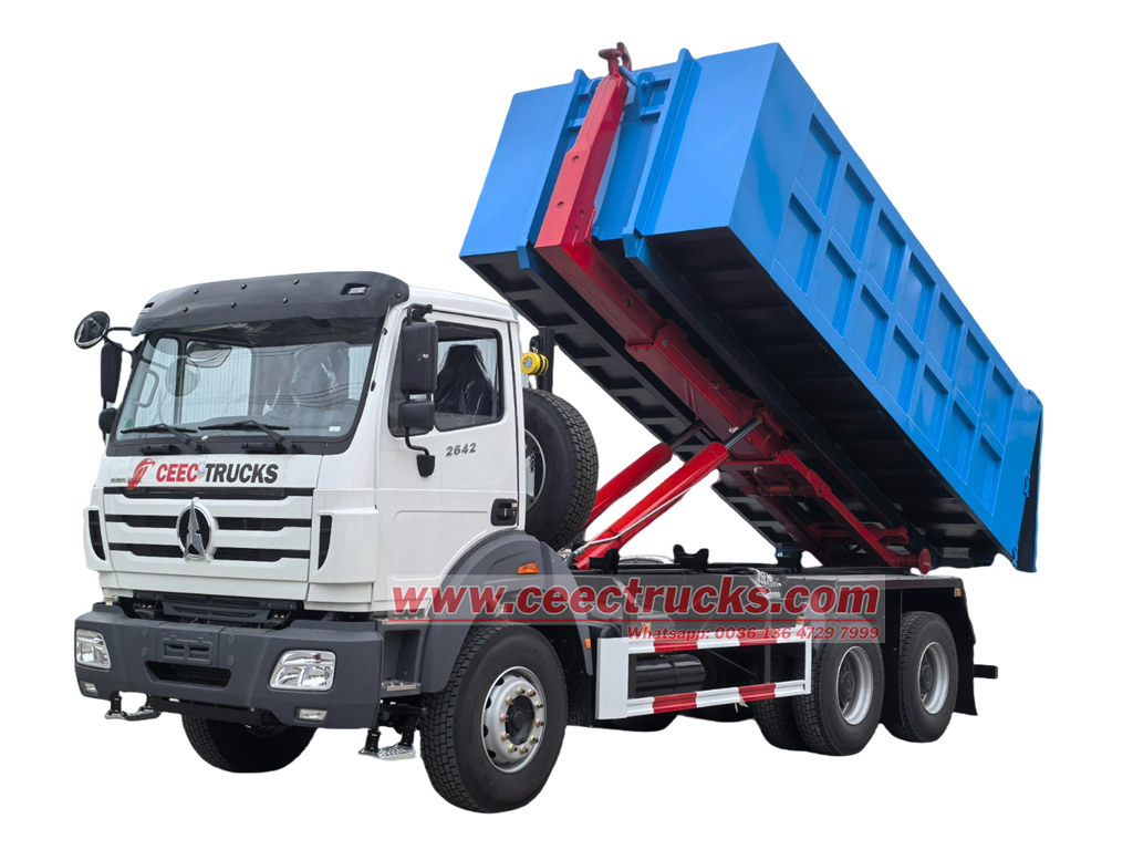 Africa customer purchased Beiben 2642 hook lift garbage truck is a vehicle specially designed to collect and transport municipal solid waste, widely used in city, residence community, factory, hospital, municipal environmental section, garabge transportation station, etc. Beiben 20tons hookloaders is produced based on North Benz 2642 LHD 6x4 truck chassis and equipped with Top 1 Chinese brand WEICHAI diesel engine WP12.420E32 model, 308KW and 420HP, efficiently emission 11596ml, which provides powerful power and stable performance, ensuring excellent performance under various operating conditions, matched working with FAST 12 shift manual transmission gearbox, which are golden partner and can offer much lower fuel consumption. The North Benz 2642 roll off container truck is equipped with 20tons hook loader superstructure, based on Q355 high strength steel material, telescopic hook arm and rear stabilizers for safety loading support. Marched working with multiple garbage containers with size 5600x2300x1500mm, with efficiently loading capacity 19.32CBM, which can quickly and effectively used for garbage collection and long distance transportation.