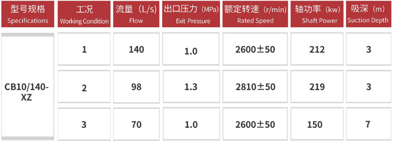 Esta bomba tem uma vazão nominal de 70 a 140 L/s, uma pressão nominal de aproximadamente 1,0 MPa e uma altura manométrica máxima superior a 100 metros. Apresenta partida rápida, alta capacidade de sucção e fornecimento de água estável. Sua forte capacidade de sucção permite uma rápida autoescorva (até uma altura de aproximadamente 7 m quando utilizada com um dispositivo de desvio de água a vácuo).