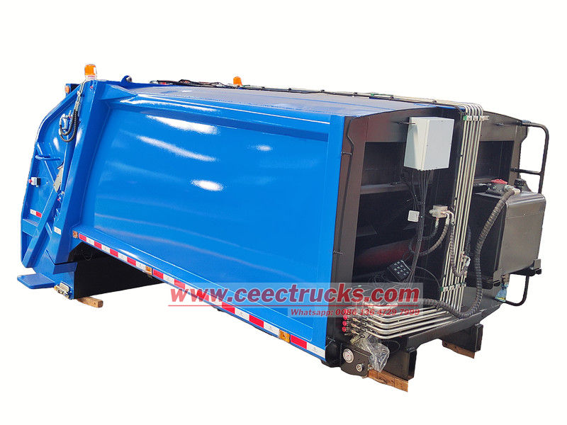 Volume optional 5-20cbmA carroceria de coleta de lixo personalizada de 10 m³ com carregamento traseiro combina coleta eficiente, compactação potente e transporte selado. Construída em aço de alta resistência e resistente ao desgaste, o compartimento selado possui um mecanismo hidráulico de carregamento e empurrador para trituração automática de resíduos e compactação de alta densidade.