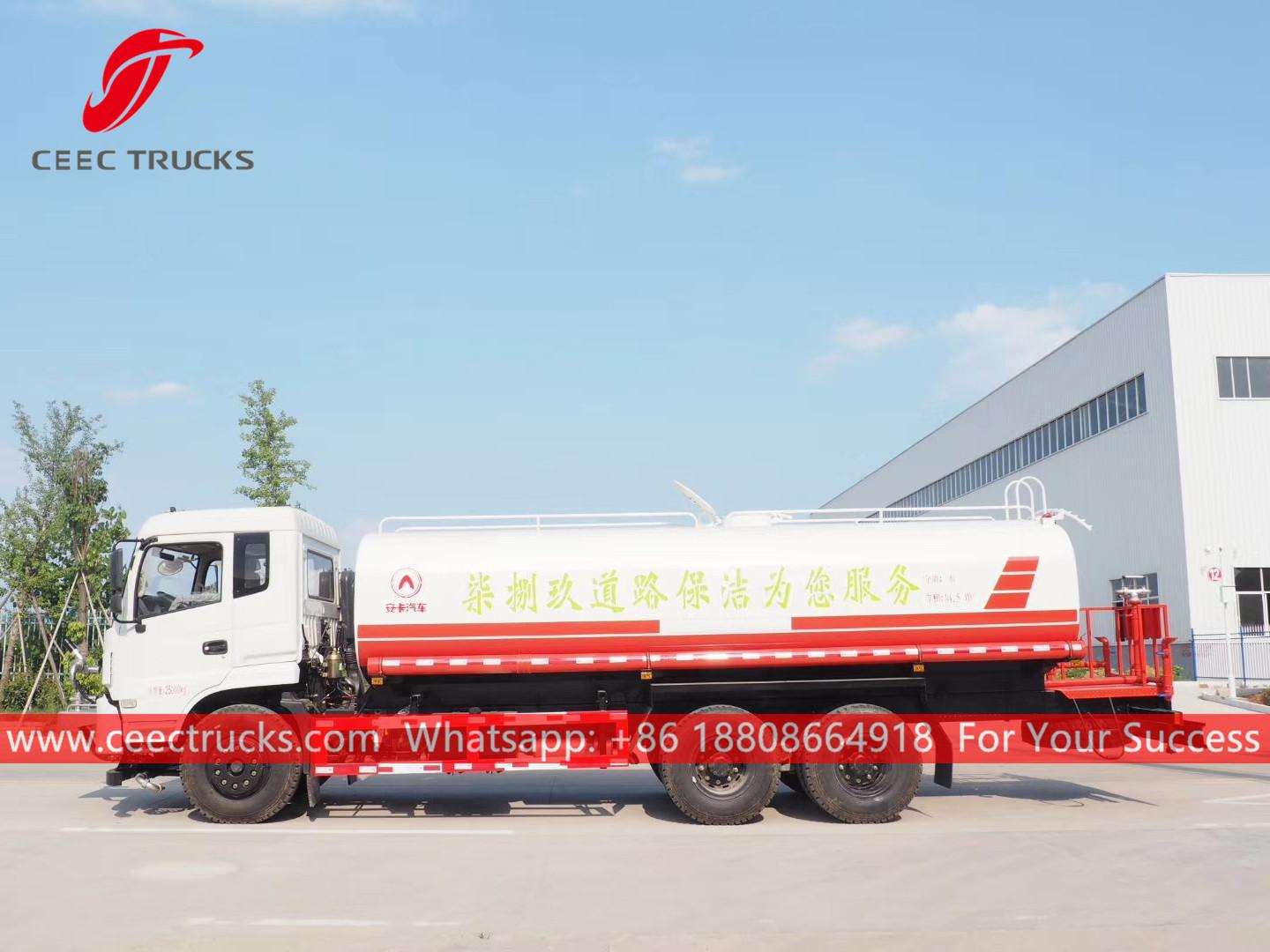 Caminhão-pipa DONGFENG 15.000L, chassi DONGFENG 6x4 com volante à esquerda, caixa manual de 8 marchas, motor diesel CUMMINS 210HP, bomba d'água de marca famosa, com bico de pulverização dianteiro, intermediário e traseiro opcional. Todas as pinturas e logotipos dependem da necessidade.