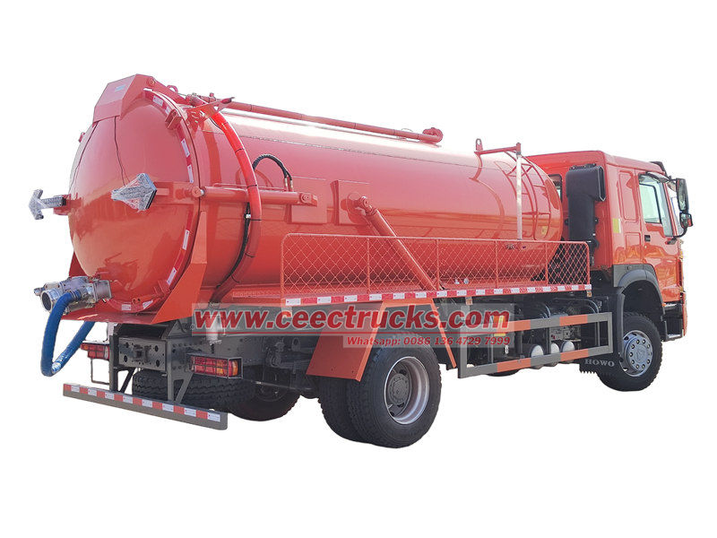 O caminhão-tanque de limpeza de esgoto Howo de 10 m³ é baseado no chassi Howo 4x2, com distância entre eixos de 4600 pés, equipado com motor diesel WP10.300E22 de 300 hp e caixa de câmbio HW13710, direção ZF8198, motor diesel Euro 3 de 9.726 litros, pneus 295/80R22.5 com 7 peças, o que o torna potente e fácil de operar. O corpo do tanque é feito de aço carbono de alta qualidade e equipado com uma bomba de vácuo de alto desempenho. Possui funções de autoescorvamento, autodrenagem e autodescarga. Possui forte sucção e alta eficiência, permitindo que o corpo do tanque seja rapidamente enchido e drenado com eficiência em uma única operação.