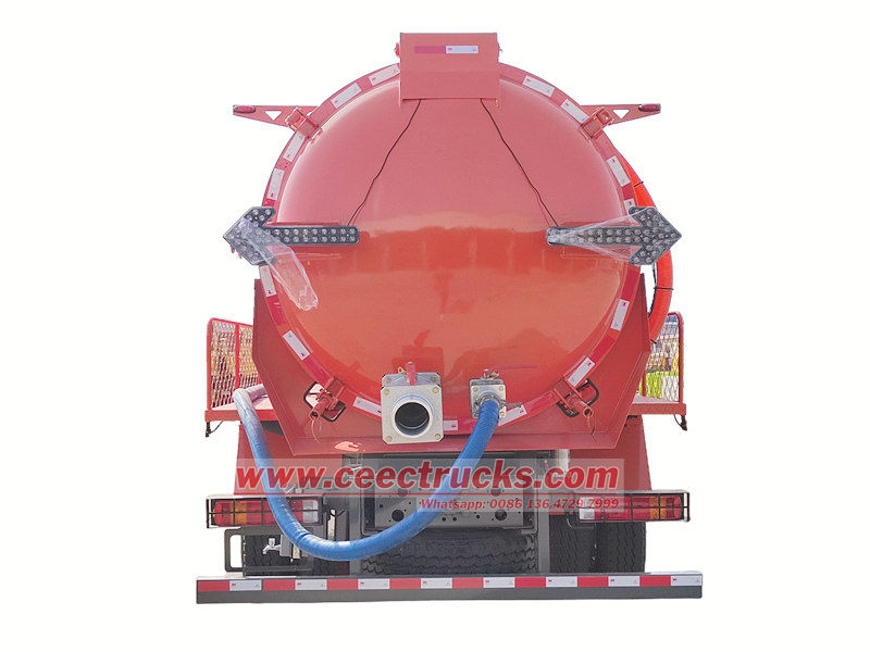 O tubo de sucção pode ser equipado com diversos bicos ou filtros para atender às necessidades de sucção de diversas aplicações, como tubulações e fossas sépticas. O caminhão de sucção a vácuo HOWO também possui uma válvula de alívio que fecha automaticamente a entrada de ar quando o nível do líquido do tanque se aproxima do limite superior, evitando refluxo de esgoto e danos à bomba de vácuo.
