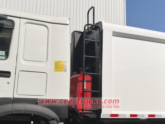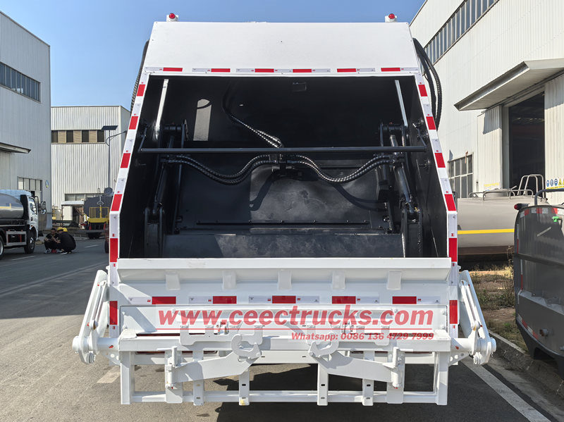 Rear tilting device for 770L and 1100L binsO caminhão compactador traseiro HOWO de 14 cbm é um equipamento essencial para o saneamento urbano, integrando tecnologias eletromecânicas e hidráulicas. Durante a operação, o sistema hidráulico aciona a pá carregadeira para comprimir fortemente o lixo, reduzindo significativamente o volume de lixo e aumentando o volume de transporte individual. Seu compartimento totalmente fechado e dispositivo de coleta de esgoto previnem eficazmente o vazamento de esgoto e o espalhamento de lixo durante o transporte, evitando poluição secundária. Ao mesmo tempo, Caminhão compactador com carregador traseiro HOWO é equipado com um sistema operacional inteligente, suporta vários métodos de coleta de lixo e é conveniente e eficiente para operar.