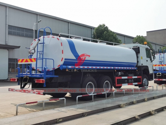 Caminhão de pulverização de água HOWO 20.000L, chassi HOWO 6x4, caixa de câmbio manual de 10 turnos, motor diesel WEICHAI 336HP, água de marca famosa bomba, com bico de pulverização frontal, intermediário e traseiro opcional. Toda pintura e os logotipos dependem da exigência.