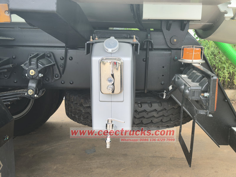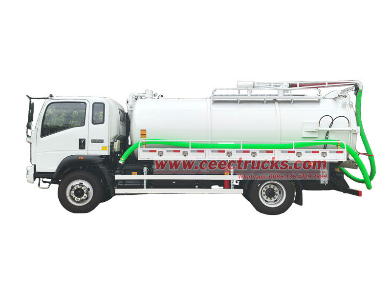 O caminhão séptico Howo de 5.000 litros com eixo simples é baseado no chassi Howo 4x2, com distância entre eixos de 4200 mm, equipado com um motor diesel YC4E160-33 de 160 hp e uma caixa de câmbio HW90510C2, com 10 marchas à frente e 2 à ré, motor diesel Euro 3 de 4,257 L, pneus 8.25R20 no total (7 unidades), o que o torna potente e fácil de operar. O tanque é feito de aço carbono de alta qualidade e equipado com uma bomba de vácuo de alta eficiência, que proporciona funções de autoescorvamento, autolimpeza e autodescarga.