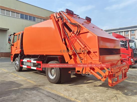 ♦ O caminhão de coleta de lixo Howo com carregamento traseiro possui um tanque curvo de 15 m³ (4 mm de espessura) feito de aço especial Q235 e um processo de moldagem integrado.