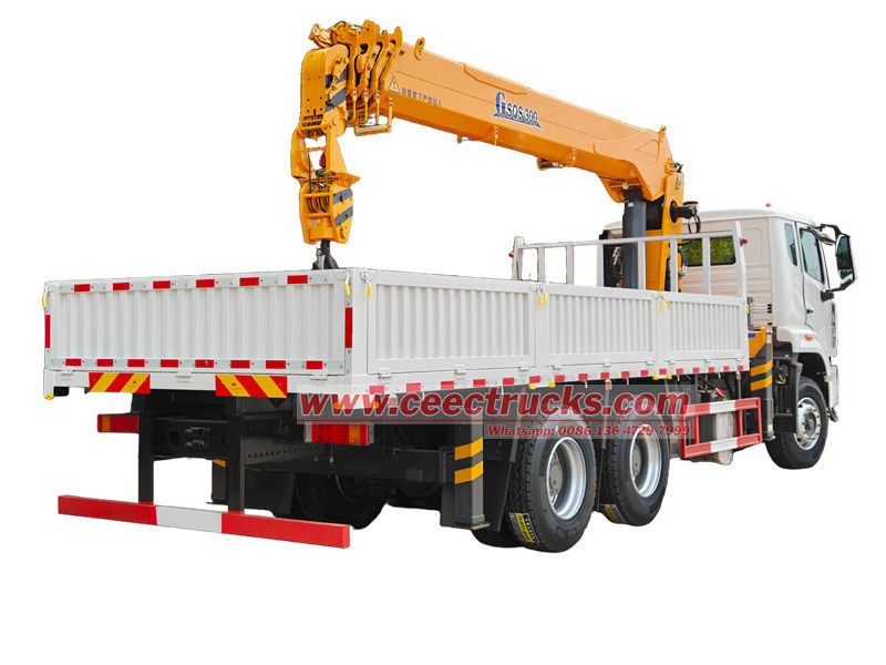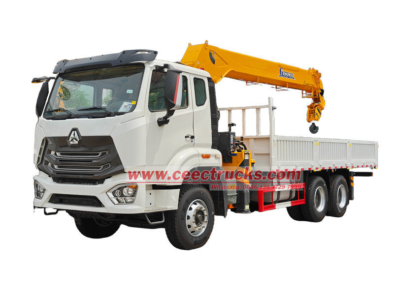 O caminhão Howo com guindaste de elevação de 12 toneladas, produzido pela CEEC, é adequado para construção, logística, infraestrutura, mineração e outras áreas. O veículo foi modificado com base no chassi HOWO NX, com distância entre eixos de 4600 + 1400 mm. É equipado com um motor WEICHAI WP10.380E22 de 380 HP e uma caixa de câmbio HW19710 de 10 velocidades. A parte superior é composta por uma caçamba de carga de 6500 x 2300 x 450 mm e um guindaste XCMG GSQS300 com capacidade de elevação de 12 toneladas. O guindaste pode ser operado por alavancas hidráulicas manuais em ambos os lados para controlar a retração e a extensão dos estabilizadores, bem como a retração e a rotação do guindaste.