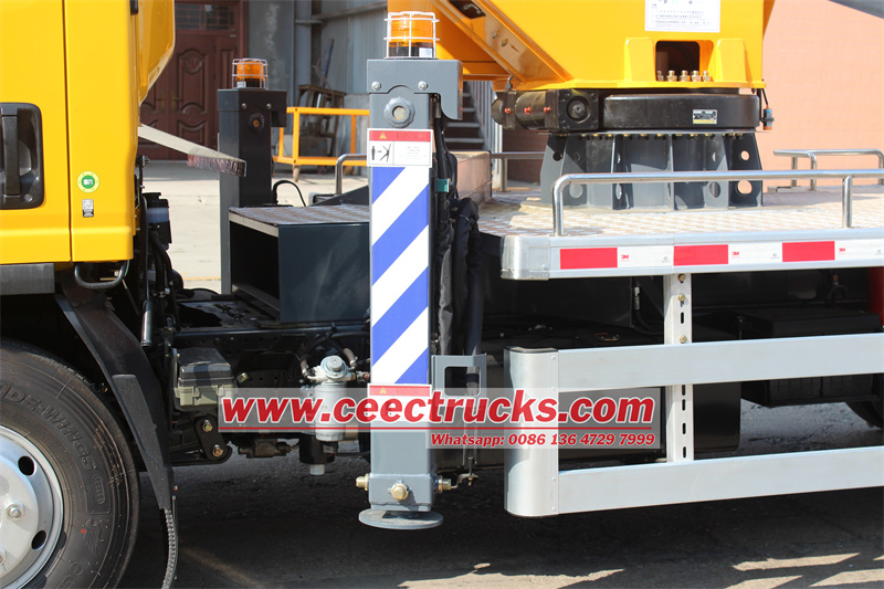 Esse Plataforma de trabalho aéreo articulado de 20m montado em caminhões de caminhão de Isuzu tem 4 estabilizadores extensíveis, favorecendo uma melhor aderência no chão e possibilitando modular o congestionamento na estrada Você pode adicionar opções como o kit de sinalização, incluindo giroscópio e triflash, um lado suspenso, baús ou proteção de alto nível