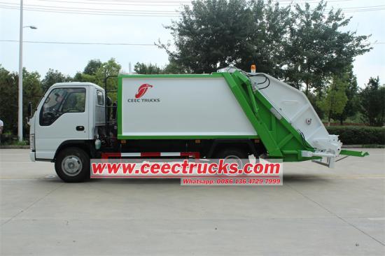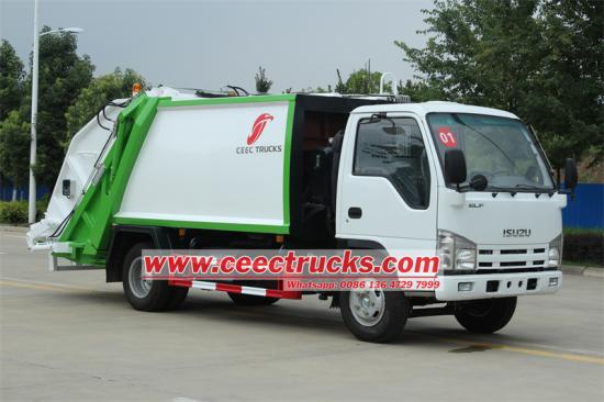 Isuzu 5 metros cúbicos O compressor de lixo é uma coleta de lixo, compressão e transferência de lixo especialmente projetados Isuzu 5cbm traseiro traseiro caminhão de lixo é um caminhão de lixo de compressão com a marca Isuzu Mini ELF 4x2 chassi à mão esquerda e um volume corporal de compartimento de 5 metros cúbicos Este carregador traseiro isuzu comprime o lixo através de um mecanismo de compressão para reduzir o volume do lixo, aumentando assim a capacidade de carregamento e a eficiência do transporte do lixo