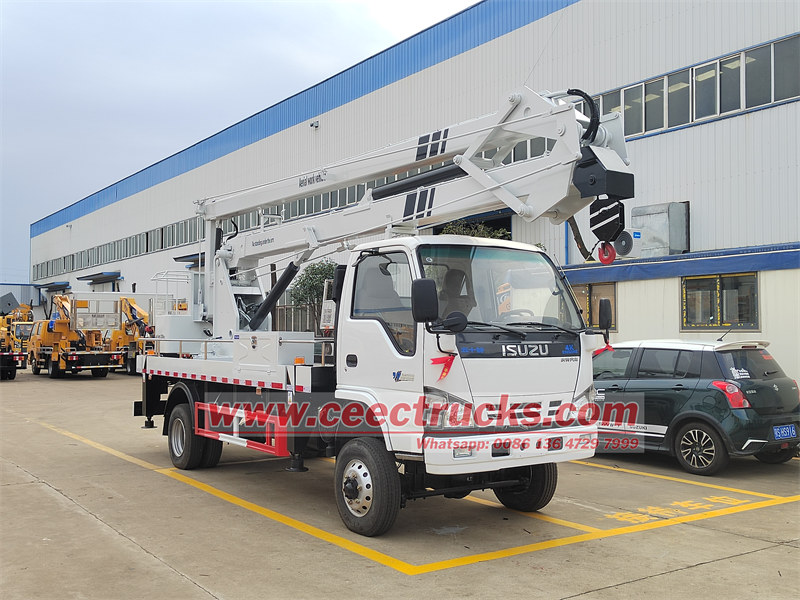 Isuzu Manlift Truck alsocalled AerialPlataFformTruck articulatedBoomlift, caminhão MountEDAerialPlataform, Aerialworkplataform, levantador de hidráulica, caminhão de caminhão montado em caminhão, caminhão de caminhão, caminhão de caminhão montado em caminhão que possuem altura de trabalho aérea 14m, 16m, 18m, 20m, 22m, 24m, 26m, 28m, 30m, 32m E o sistema de rotação permitirá rotação contínua de 360 graus, com um sistema de segurança para evitar quedas repentinas em caso de falha.