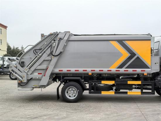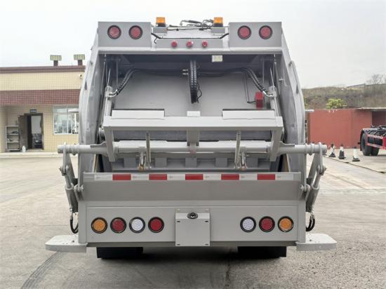 2. Compartimento de lixo: O compartimento é feito de materiais de alta resistência, aço carbono de alta qualidade, como aço manganês Q345, e é formado por soldagem totalmente selada. O volume varia de 4 a 20 metros cúbicos. O projeto do compartimento inclui uma estrutura em arco, uma placa de compactação bidirecional, um tanque de esgoto (volume ≥ 200L) e um dispositivo de vedação antivazamento para prevenir eficazmente a poluição secundária.