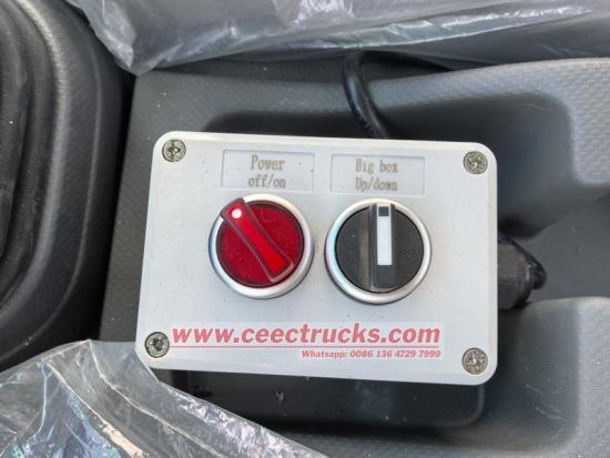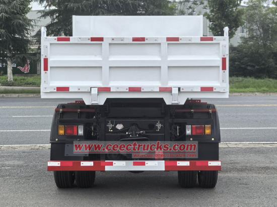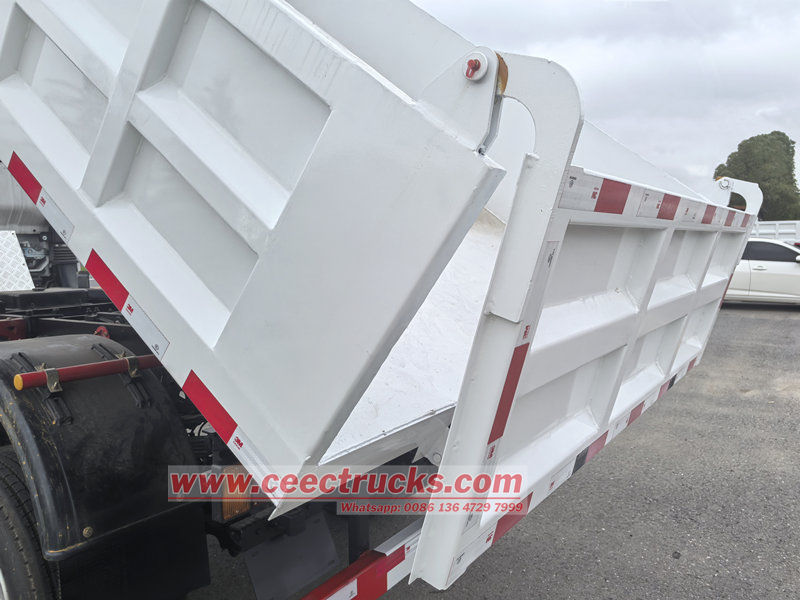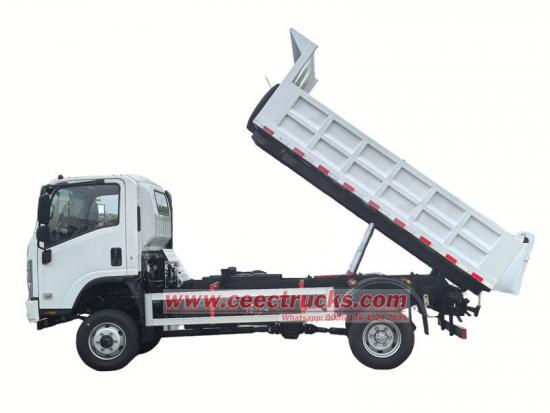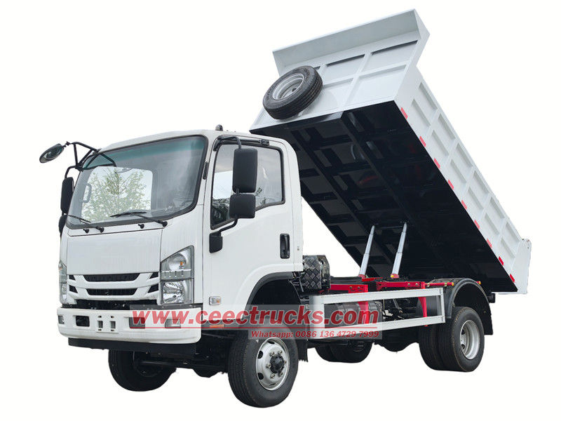O caminhão basculante Isuzu com tração 4x4 é modificado com base no chassi de tração integral Isuzu ELF NPR, com distância entre eixos de 3815 mm, equipado com motor diesel Isuzu 190HP 4HK1-TCG61, caixa de câmbio Isuzu MLD-6 e uma caçamba feita de aço carbono com três lados e quatro fundos, 4200×2200×550 mm, elevação central, elevação estável, descarga limpa e rápida, portas traseiras podem ser abertas e o veículo é controlado pela válvula de controle no lado do motorista, que é fácil de operar.