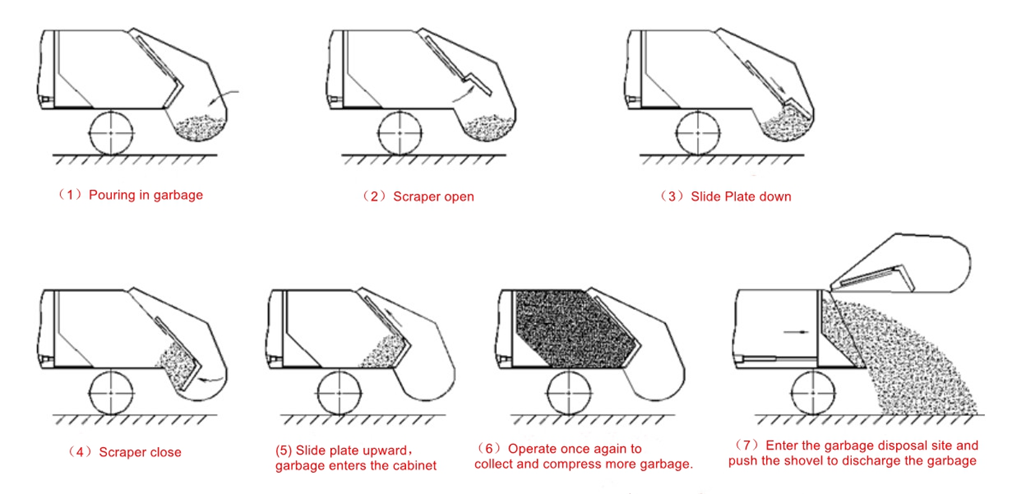 O processo de trabalho do caminhão de lixo de compressão é mostrado na figura