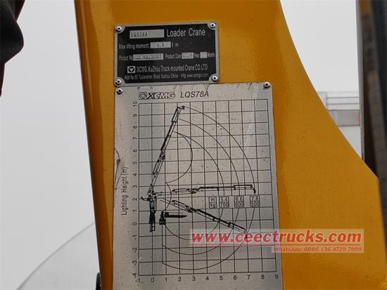 O caminhão guindaste Isuzu KV600 é uma modificação do chassi do Isuzu KV600, com massa total de 8.280 kg, peso bruto de 5.295 kg, distância entre eixos de 3.815 mm e está equipado com um motor Isuzu 4KH1CN6HB Euro VI, uma caixa de câmbio Isuzu MLD de 6 velocidades, pneus 750R16 e velocidade máxima de 105 km/h. A parte superior é uma lixeira de formato irregular com espessura de 3 mm nas laterais e 4 mm na parte inferior, com dimensões de 4.000 × 2150 × 1200 mm, feito de aço carbono e equipado com um guindaste de carga XCMG LQS78A. A extremidade do guindaste de garra é uma garra com duas garras para agarrar toras.