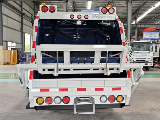 Semi-sealed bucket flip mechanismO e O caminhão compactador de lixo leve ISUZU NPR é um caminhão de lixo para serviços urbanos com excelente desempenho. É equipado com um motor 4HK1-TCG61 com potência máxima de 190 cavalos e cilindrada de 5,19 litros. Adota um projeto de intercooler turboalimentado de 4 cilindros em linha. O peso total do veículo é de 11 toneladas e a capacidade de carga real é de 4,9 toneladas. O chassi tem tração 4x2 e a distância entre eixos é de 1,5 m. 3815 mm. A lixeira tem capacidade para 10 metros cúbicos e é feita de chapas de aço integral curvas. As chapas inferior e lateral são feitas de aço especial Q235 com 4 mm de espessura e a taxa de compressão atinge 1:3,4.