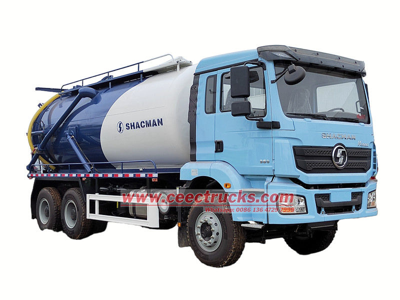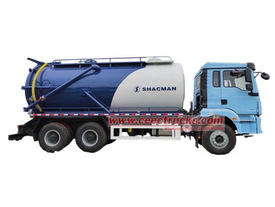 Caminhão-tanque de sucção a vácuo Shacman de 6000 galões (também chamado de caminhão de bomba de sucção a vácuo Shacman 6x4, caminhão de bomba de tanque séptico Shacman H3000, caminhão de sucção a vácuo Shacman de 22 m³, caminhão-tanque para descarte de esgoto Shacman 6x4, caminhão de sucção de esgoto a vácuo Shacman, etc.) Este veículo foi projetado para coletar, transportar e descarregar diversos materiais, incluindo águas residuais, lodo, resíduos sépticos, petróleo bruto, além de pequenos detritos sólidos como pedras e tijolos. É especialmente adequado para a limpeza de esgotos, fossas sépticas, sarjetas e ambientes similares.