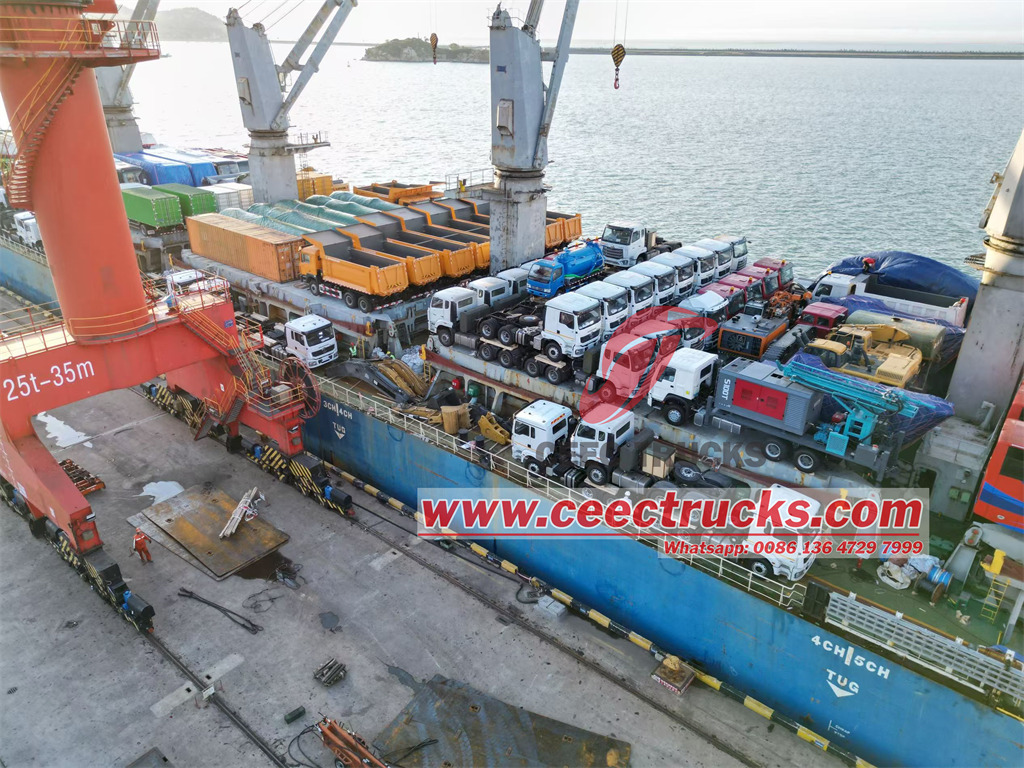 CEEC TRUCKS é bom em exportar caminhões para o exterior. O transporte de caminhões especiais customizados geralmente se refere a um método logístico que envolve uma combinação de transporte marítimo e transporte rodoviário, o que é mais comum na logística internacional, especialmente para mercadorias grandes ou pesadas, como caminhões, equipamentos mecânicos, etc. : Caminhões Isuzu, caminhão de lixo, caminhão compactador de lixo, caminhão a vácuo, kits para parte superior do corpo, caminhão de combate a incêndio, caminhão guindaste, caminhão de combustível, caminhão-pipa, caminhão municipal, caminhão de carga, caminhão semitraielr, caminhão beiben