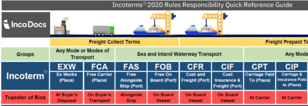 CIF: O local de entrega é no porto de destino do comprador, o vendedor é responsável pelo transporte, seguro, procedimentos de exportação e importação, a responsabilidade é transferido no lado do navio no porto de embarque, mas o custo inclui frete e seguro até o porto de destino.