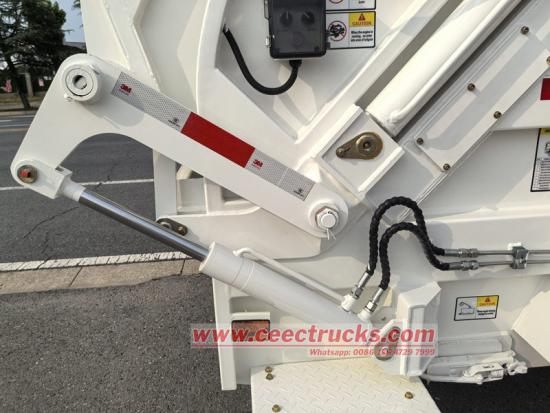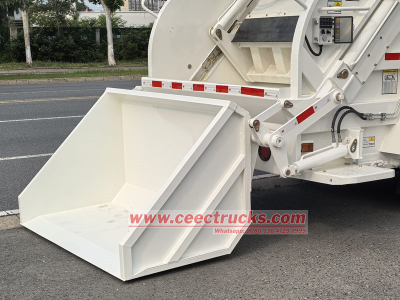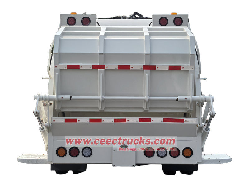 ● A lixeira e o carregador do caminhão de lixo com carregador traseiro HOWO são ambos feitos de estruturas soldadas em chapa de aço carbono de alta qualidade, e a lixeira adota uma seção transversal em forma de arco. A lixeira é equipada com uma pá dobrável, acionada por um cilindro de pá e que pode deslizar ao longo dos trilhos-guia em ambos os lados da parte inferior da lixeira. A pá não serve apenas para descarregar o lixo, mas também para fechar a parte frontal da lixeira.