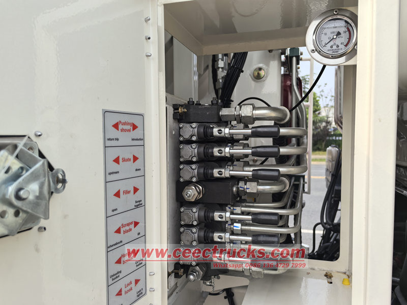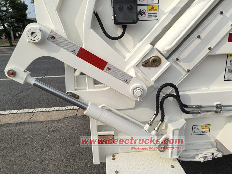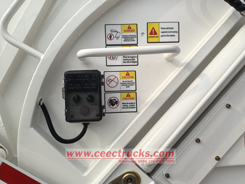A caixa de controle de operação é instalada na cabine e na traseira do veículo. A caixa de controle de operação na cabine pode controlar o empurrar e o descarregar, bem como selecionar o modo de operação (como automático ou manual), enquanto a caixa de controle de operação na traseira do veículo controla a operação do mecanismo de prensagem e enchimento, bem como o mecanismo de giro do tambor. É muito conveniente de usar e operar. Especialmente em aterros sanitários, os operadores podem concluir o descarregamento e o descarte de esgoto sem precisar sair do veículo. Dispositivos de controle remoto com fio podem ser instalados de acordo com as necessidades do usuário.