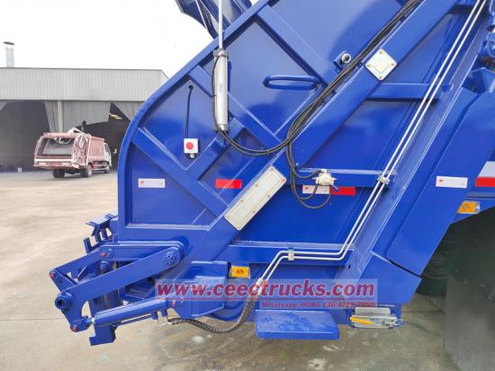 O veículo é equipado com um sistema de acionamento totalmente hidráulico, permitindo que os operadores realizem todo o processo de carga, compactação e descarga de lixo usando um painel de controle ou controle remoto sem fio, reduzindo a intensidade do trabalho. Além disso, o veículo é equipado com um sensor que monitora o nível do contêiner em tempo real, interrompendo automaticamente a compactação e emitindo um alerta para evitar sobrecarga. Para maior segurança, a porta traseira possui um mecanismo de travamento hidráulico para evitar vazamentos durante o transporte. Um sistema de freio de emergência e um dispositivo anti-capotamento garantem ainda mais a segurança ao dirigir.